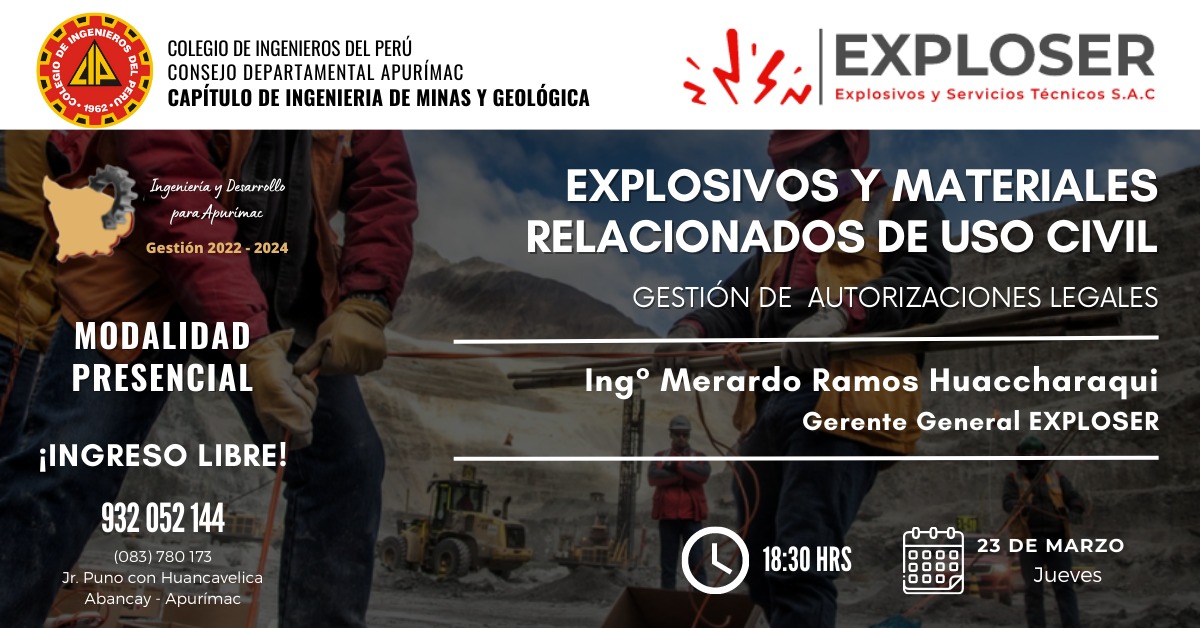 Organizado por el Capรญtulo de Ingenierรญa de Minas y Geolรณgica del Colegio de Ingenieros del Perรบ CD Apurรญmac en coordinaciรณn con EXPLOSER.