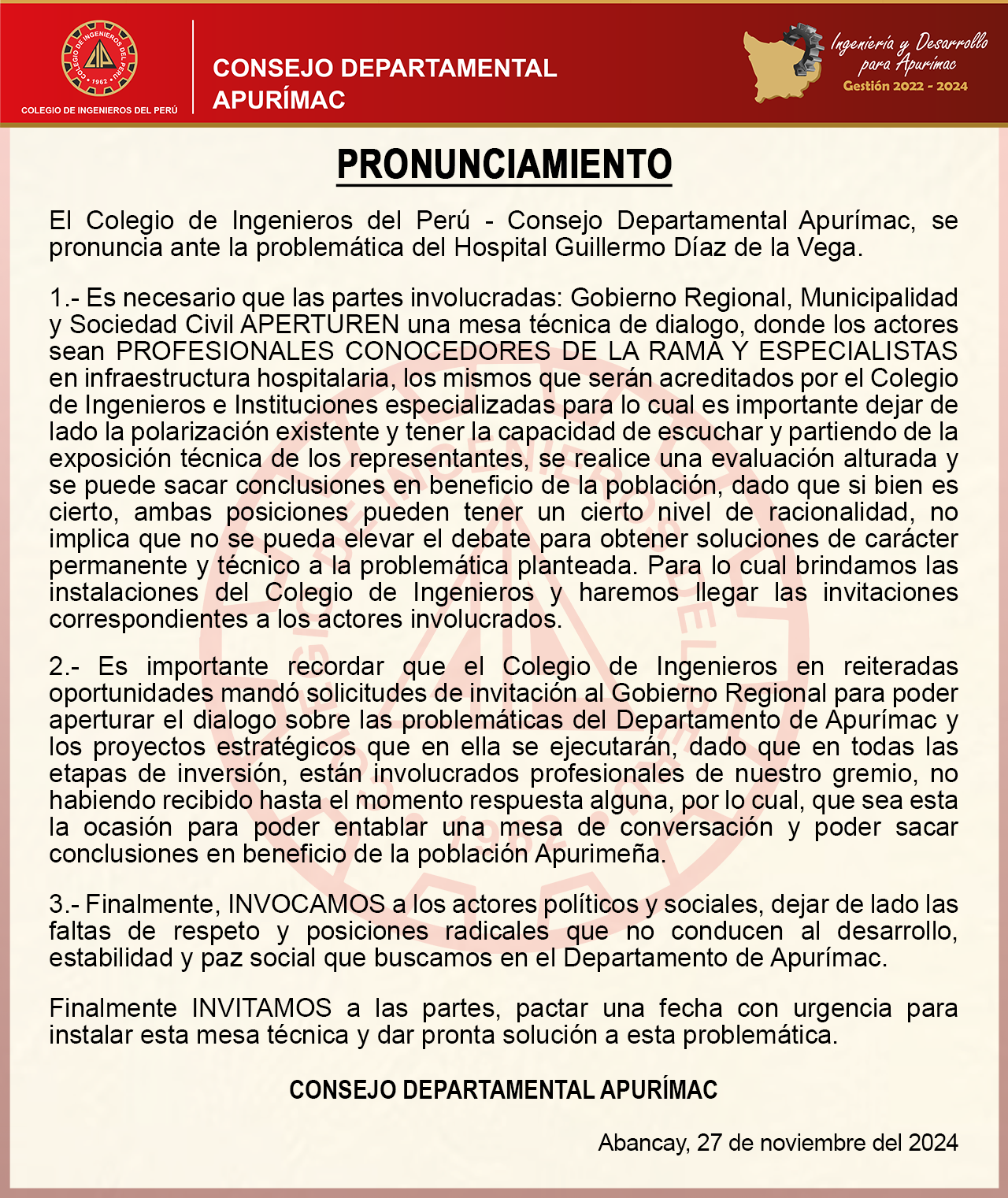 El Colegio de Ingenieros Consejo Departamental ApurΓmac se pronuncia ante la problemΓ‘tica del Hospital Guillermo DΓaz de la Vega.