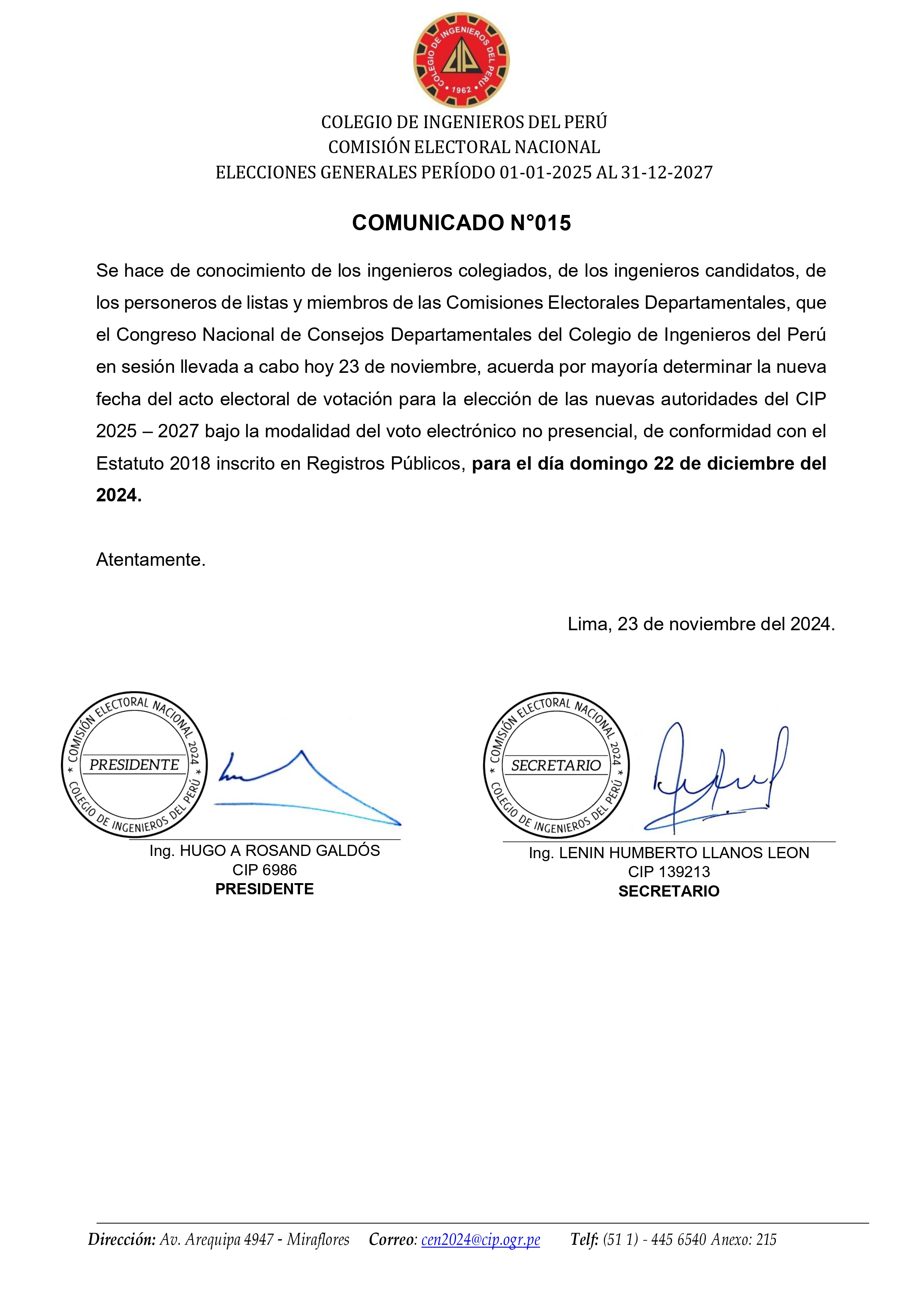 Buen dรญa, se confirma la nueva fecha de elecciones VENP, para el dรญa Domingo 22 de diciembre del 2024. Para lo cual solicitamos a los ingenieros que no han actualizado datos, enviarnos su informaciรณn (CIP, DNI, Correo y Celular) al whatsapp del nรบmero institucional 932 052 144.