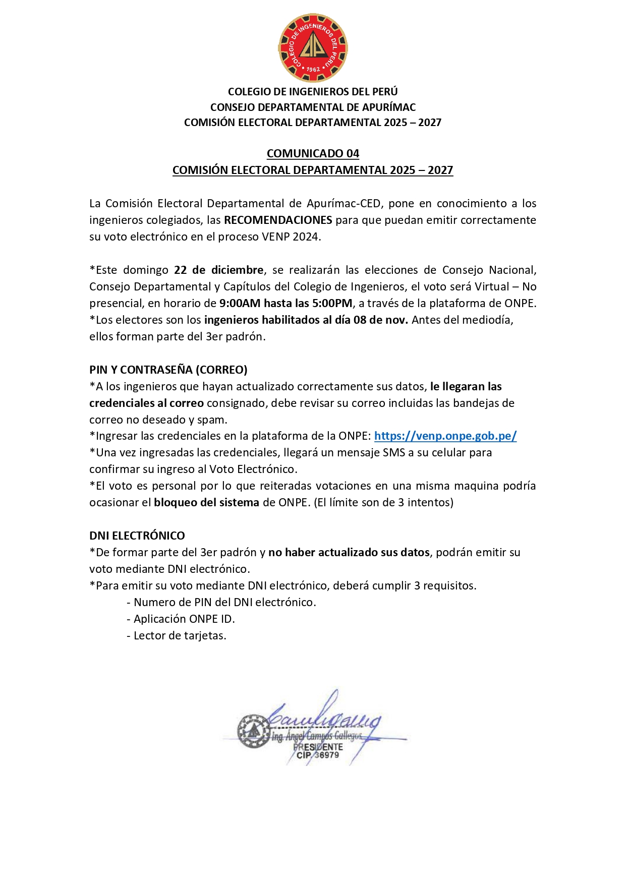 πCOMUNICADO 04 – RECOMENDACIONES PARA EL VOTO ELECTRΓNICOπ
