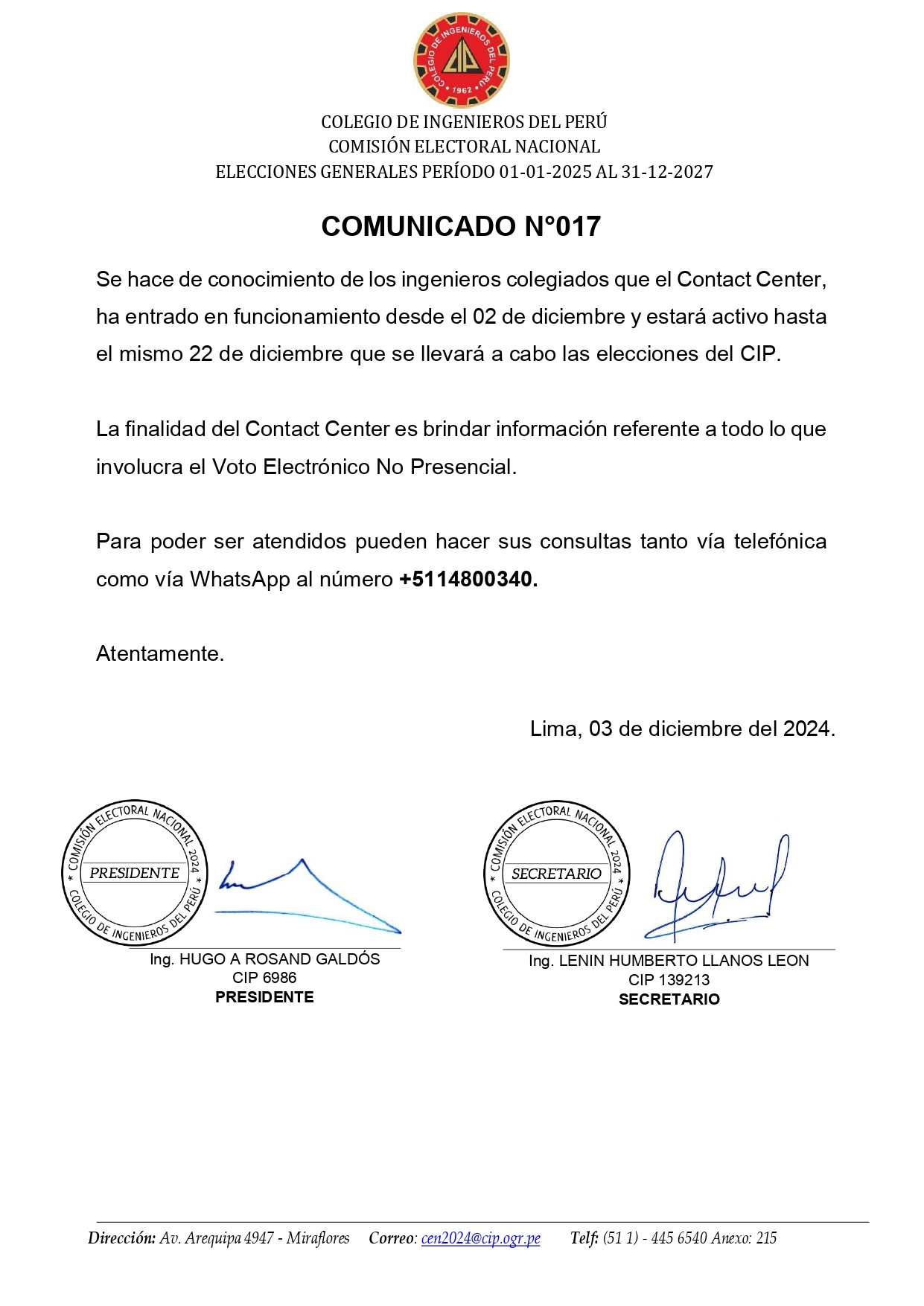 CONTACT CENTER ha entrado en funcionamiento desde el 02 de diciembre y estará activo hasta el mismo 22 de diciembre que se llevará a cabo las elecciones del CIP.