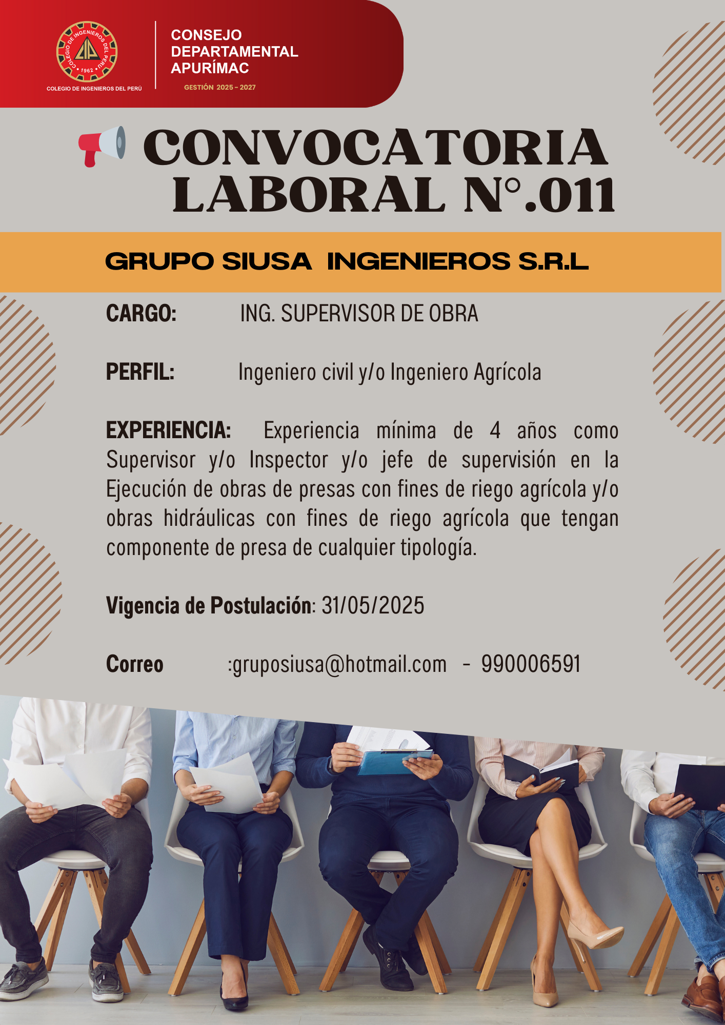 πŸ“ŒππŽπŒππ‘π„ : GRUPO SIUSA INGENIEROS S.R.L πŸ“π‚π€π‘π†πŽ : Ingeniero supervisor de obra πŸ‘€ππ„π‘π…πˆπ‹ : Ing. Civil o Ing. AgrΓ­cola πŸ“‘π„π—ππ„π‘πˆπ„ππ‚πˆπ€ : Experiencia mΓ­nima de 4 aΓ±os como Supervisor y/o Inspector y/o jefe de supervisiΓ³n en la EjecuciΓ³n de obras de presas con fines de riego agrΓ­cola y/o obras hidrΓ‘ulicas con fines de riego agrΓ­cola que tengan componente de presa de cualquier tipologΓ­a. πŸŸ₯𝐅𝐄𝐂𝐇𝐀 𝐃𝐄 π‚πˆπ„π‘π‘π„ 𝐃𝐄 ππŽπ’π“π”π‹π€π‚πˆπŽΜπ: 31/05/2025πŸŸ₯ π‹πˆππŠ 𝐃𝐄𝐋 𝐓𝐃𝐑 : https://bit.ly/3YXDiNt π‚π¨π«π«πžπ¨: gruposiusa@hotmail.com π—§π—˜π—Ÿπ—˜Μπ—™π—’π—‘π—’ :990006591